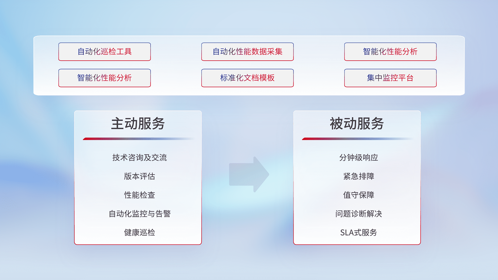 智能化工具和标准化文档,,保障服务质量,,提供主动服务(包含技术咨询、、版本评估、、、、性能检查、、、自动化监控与告警、、健康巡检)和被动服务包含(分钟级响应、、、、紧急排障、、、、值守保障、、、、问题诊断解决、、SLA服务)。。