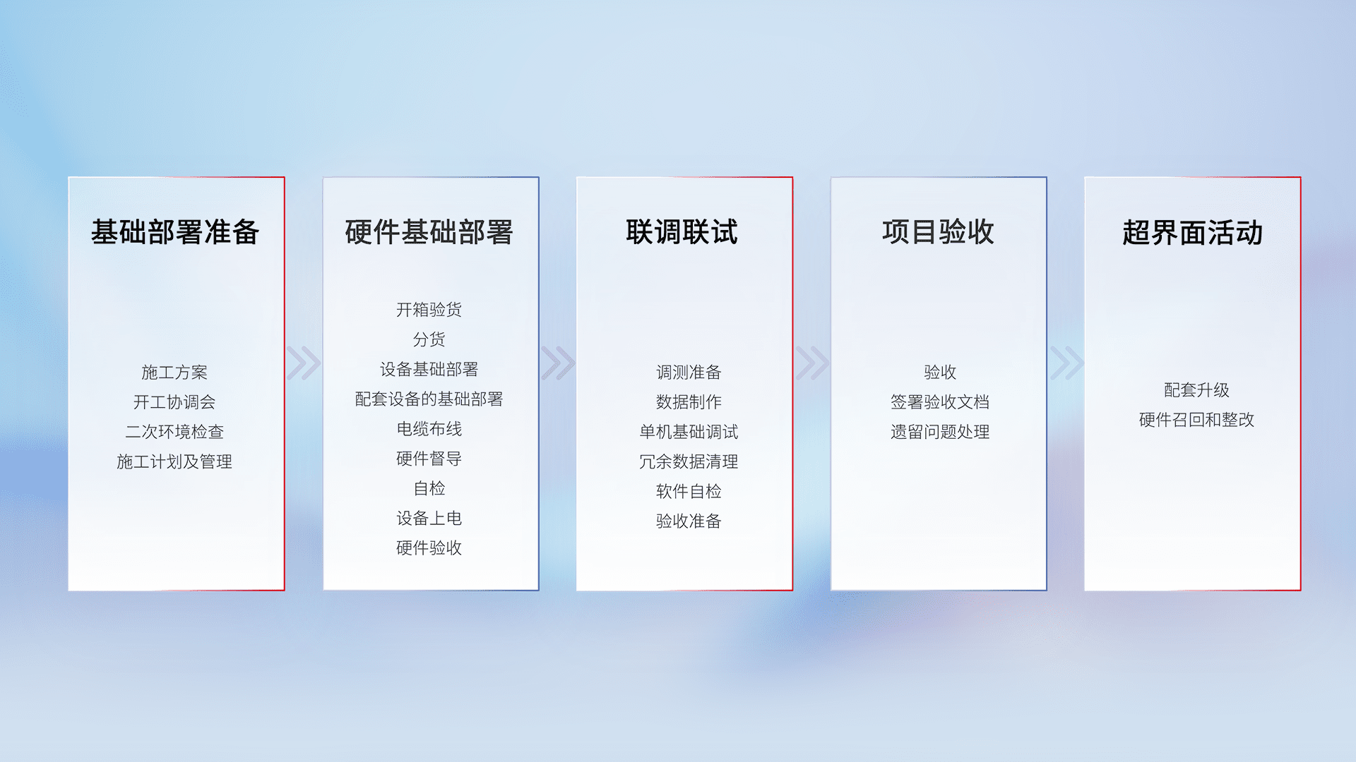 从基础部署准备、、、硬件基础部署、、、联调联试、、项目验收、、、越界面活动的全过程可追溯,,,,保证施工质量和进度。。